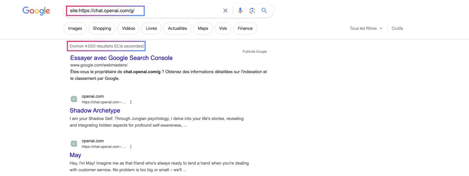 En attendant la sortie du GPT Store, vous pouvez découvrir des milliers de GPTs sur Google en cherchant :