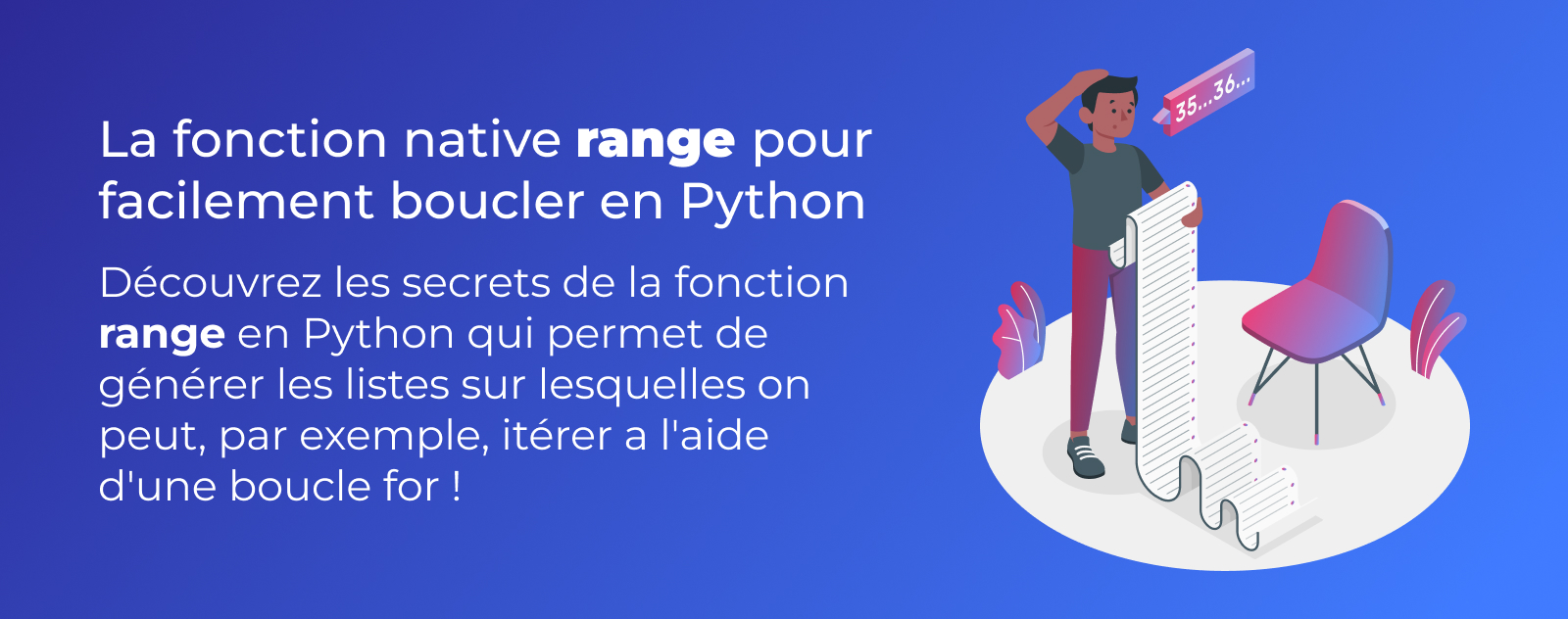 Comme on l’a vu dans cet autre article sur la boucle for en python, on a juste besoin d’un iterable pour boucler dessus. Et ça tombe bien, c’est ce que la fonction range nous renvoie !